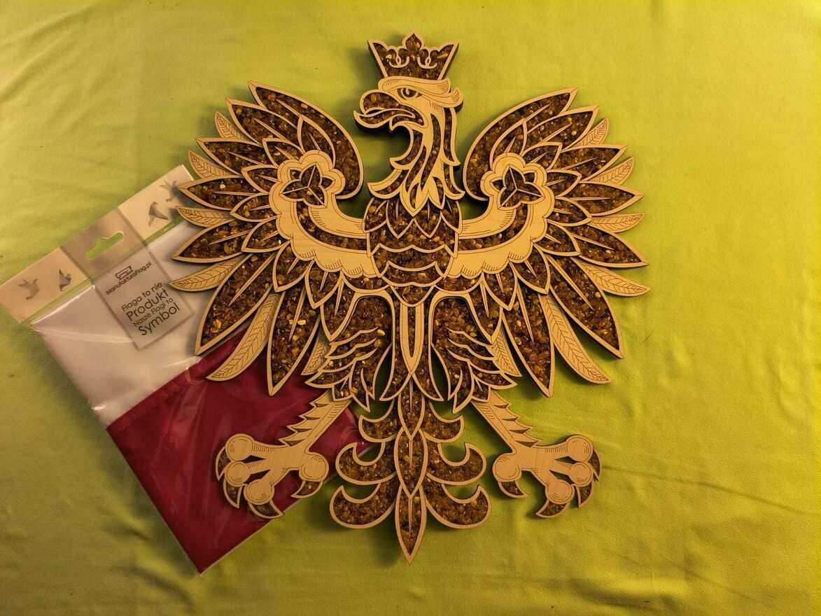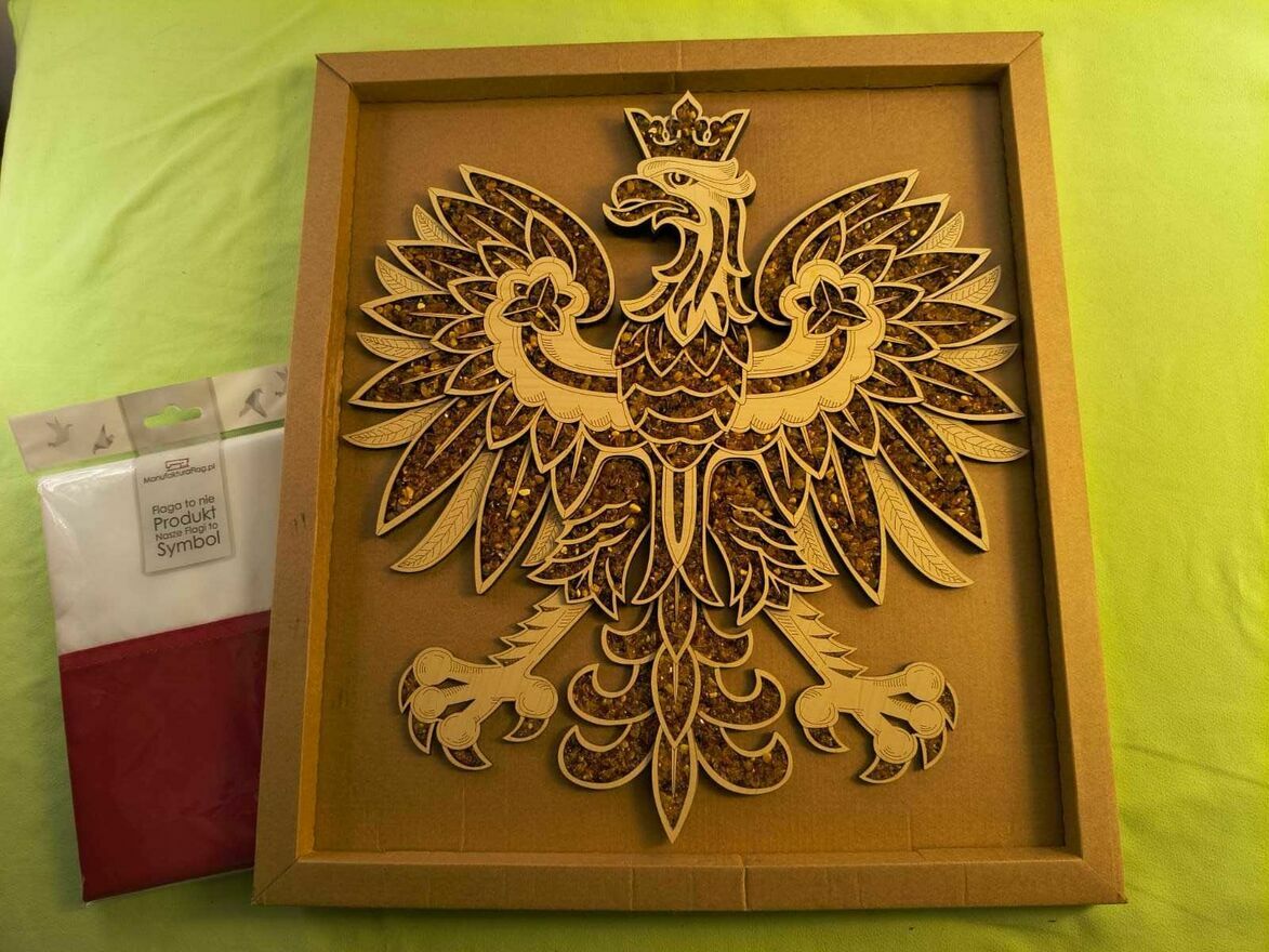 Orzeł w koronie z bursztynami - Godło - Flaga PolskiWycięty ze sklejki z wypełnieniem bursztynowym 40 cm x 36 cm