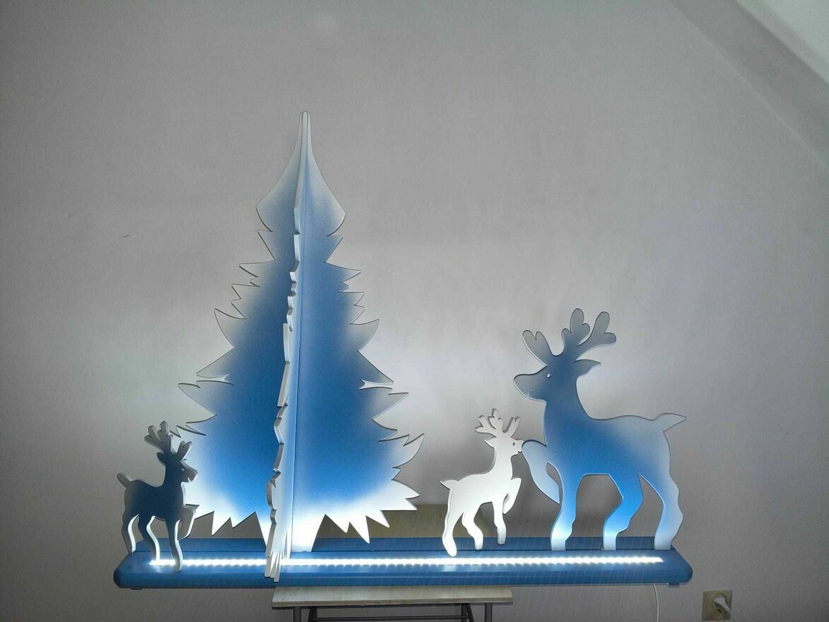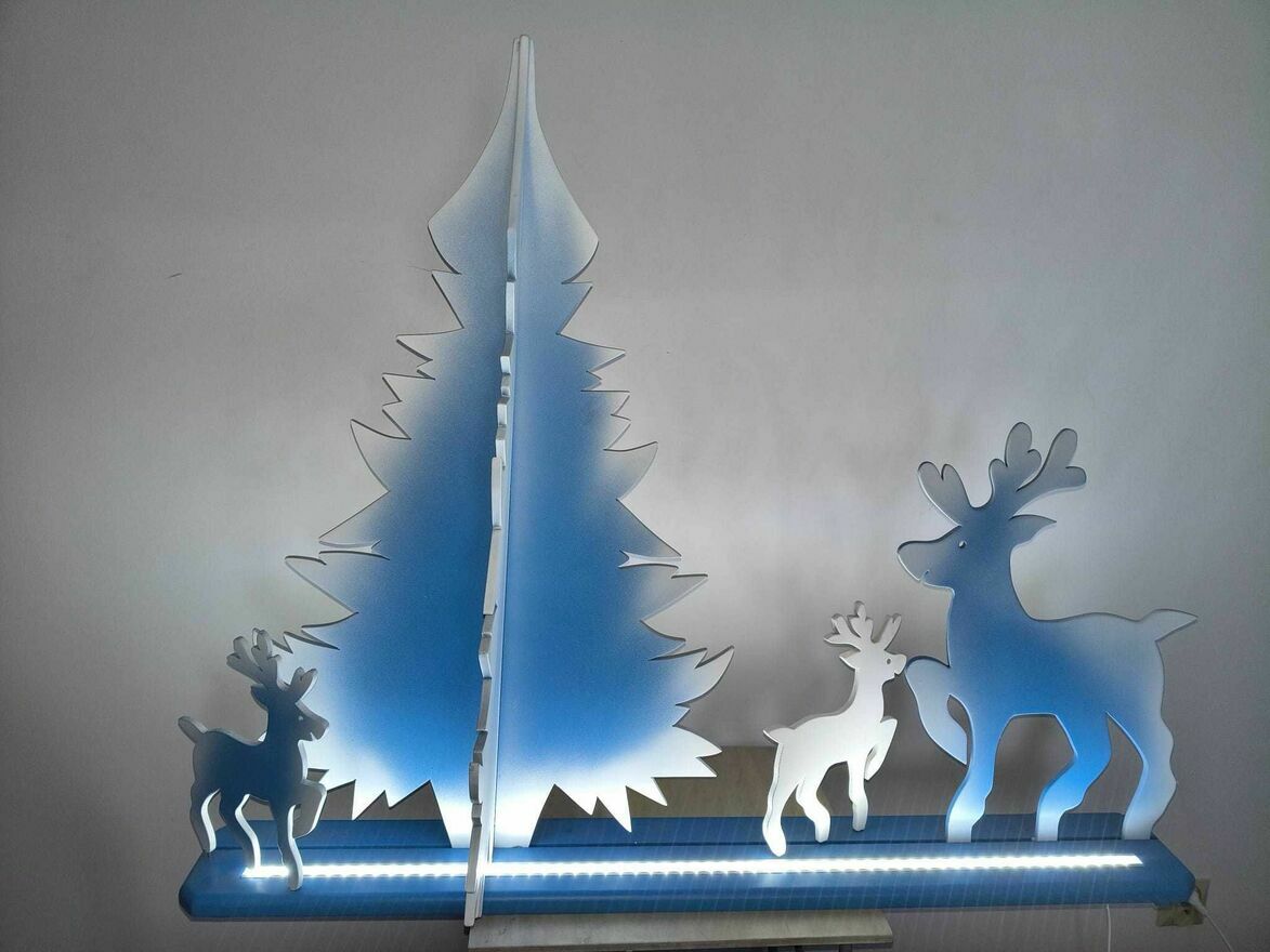 Piękna, podświetlana dekoracja bożonarodzeniowa w kształcie choinki i reniferów. Wykonana z wysokiej jakości materiałów, która wprowadzi magiczny nastrój w Twoim domu podczas świąt. Idealna ozdoba na stolik lub półkę, która rozświetli wnętrze.wys. 88 cm