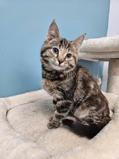 Fluffy ma około 3–4 miesiące. Jest śliczną koteczką o wyjątkowym umaszczeniu – ciemne pręgowane futerko z rudymi ...